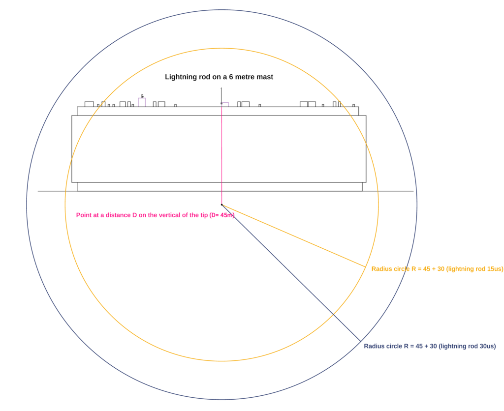 However, the results are identical for any lightning arrester, height and level of protection. There is no one protection radius according to the Technical Building Code (CTE) and a different one according to the UNE21186 standard, despite the fact that it appears in a lot of commercial documentation and measurements. This confusion comes from the misinterpretation of the Technical Building Code (CTE). This misinterpretation, however, is dangerous, as it assumes that the lightning arrester protection is maximum at roof level, which is not true, and can therefore leave particularly vulnerable areas unprotected.