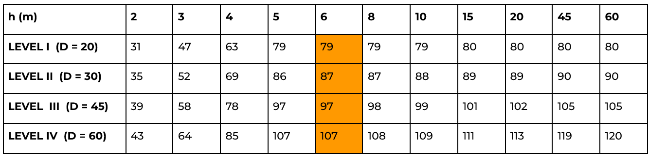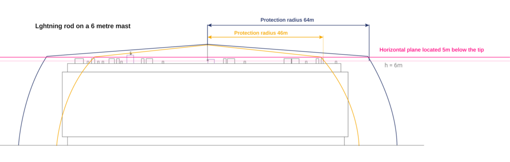 At Aplicaciones Tecnológicas we always recommend installing the air terminal so that it is 6 metres above the roof, in order to protect the objects on the roof and the corners of the roof, which are the most likely to be hit by lightning. As can be seen in the previous illustration and in the following table, with a difference of fewer than 5 metres the protection radius decreases a lot, and from that height onwards the increase is not highly significant.