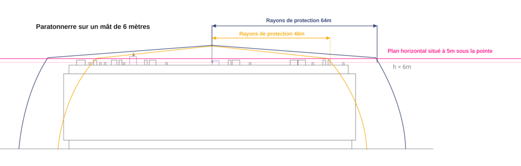 La couverture du paratonnerre est, comme indiqué dans le CTE, la section de circonférence jusqu’au sol pour h>5m, et un cône au-dessus de ce plan.