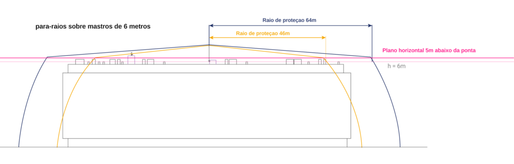 A cobertura do para-raios é, como indicado no CTE, o tramo circunferencial até ao solo para h>5m, e um cone acima deste plano.
