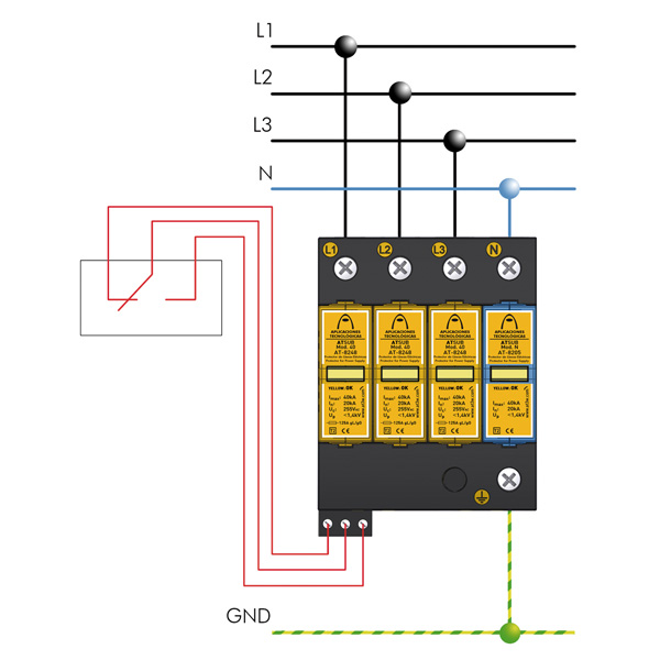 ATSUB-4P 65 TT - Protector para líneas de suministro eléctrico tipo TT. Con módulos enchufables. Conexión para aviso remoto. 4 polos.Tipo 1+2. Uc = 460 VAC (L-L). Iimp = 15 kA. Imax =65 kA. Up(In) = 1600 V. Up(1,2/50) = 900 V. Tamaño 4DIN.